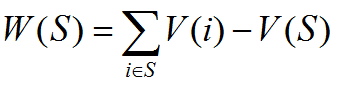 Розглянемо наведену характеристическую функцію W(S), яка для кожної коаліції висловлює “сумарну економію довжини маршруту” і дорівнює сумі довжин радіальних маршрутів мінус довжина найкоротшого кільцевого маршруту, тобто
