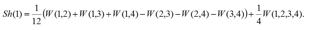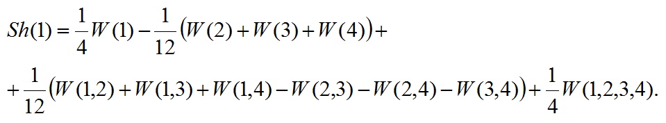 Для випадку чотирьох гравців 1-я компонента вектора Шеплі може бути обчислена за формулою