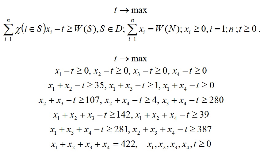 Знайдемо n-ядро даної гри. Для цього потрібно буде вирішити ланцюжок завдань лінійного програмування (ЗЛП). Перша ЗЛП ланцюжка зводиться до максимізації мінімальної з переплат по набору всіх можливих коаліцій, за винятком порожній коаліції і гранд-коаліції. Нехай t- шукана величина мінімальної переплати, тоді ЗЛП набуває вигляду: